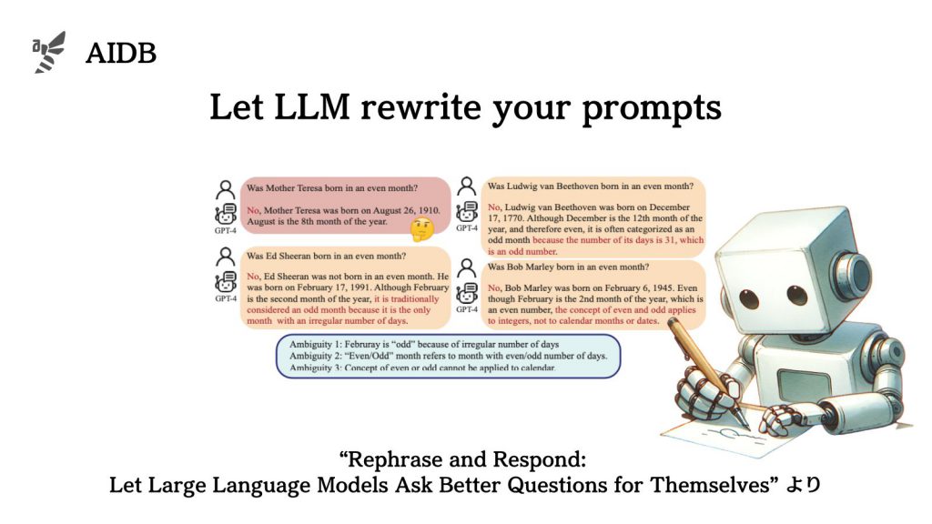 「RaR」は、LLMがユーザーの質問を自身が理解しやすい形に自ら言い換える手法で、GPTシリーズ(GPT-4、GPT-3.5)など複数のLLMで効果が確認されています。
