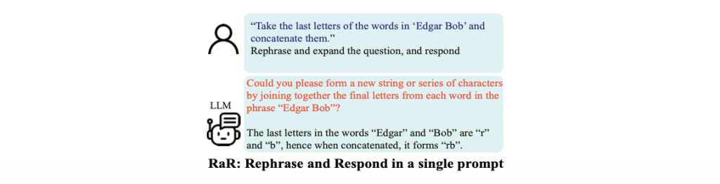 今回カリフォルニア大学の研究者たちは、LLMに対して、人間の質問を自分で言い換えて応答させるためのプロンプト指示「RaR(Rephrase and Respond)」という新しい方法を提案しています。RaRは、パフォーマンスを改善するためのシンプルで効果的なプロンプト方法です。LLMが人間からの指示を言い換えて拡張を行い、単一のプロンプトで応答を提供します。