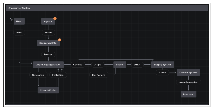 このフレームワークにおける重要な役割を果たすのが「ショーランナーエージェント」です。ショーランナーエージェントは、物語の進行と行動制御を担当し、一貫性のあるストーリーテリングを行います。これは、シミュレーション上で「脚本家・監督」が機能するイメージです。