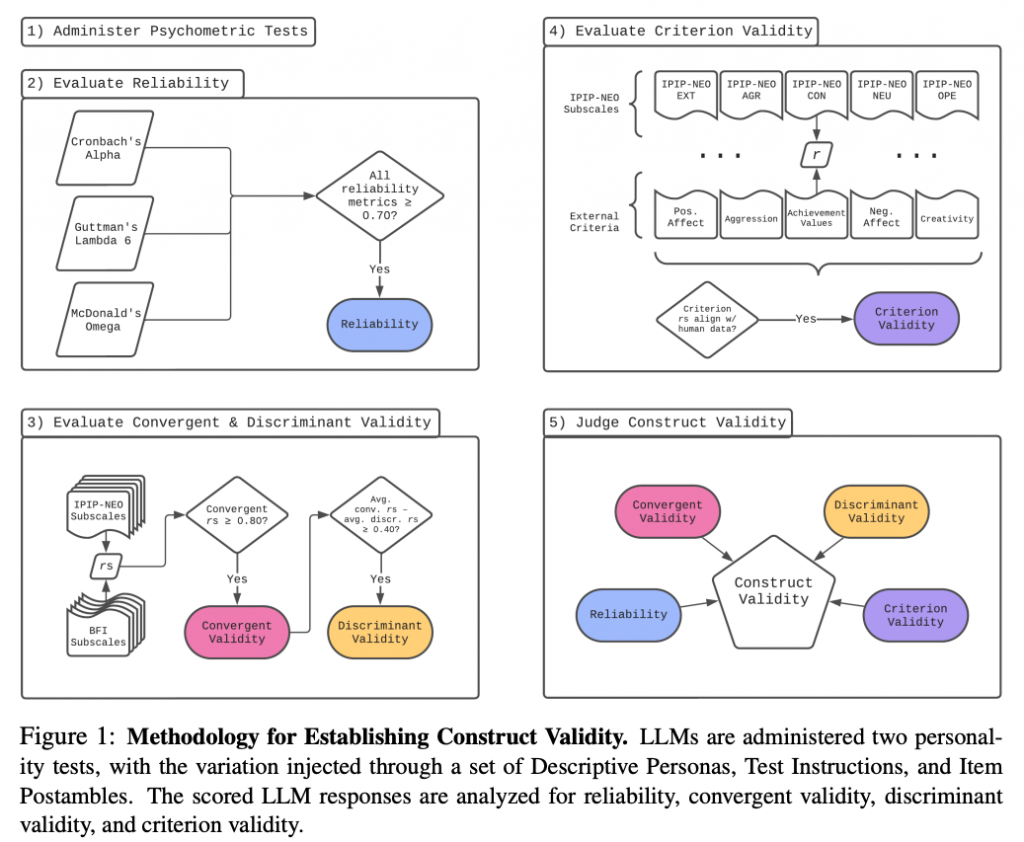 研究者らは、異なる理論的背景を持つ2つの性格評価と、11の別々の心理測定テストをLLMに繰り返し行いました。このプロセスでは、LLMの回答の心理測定特性を厳密に評価し、その信頼性と構造的妥当性を統計的に分析しました。