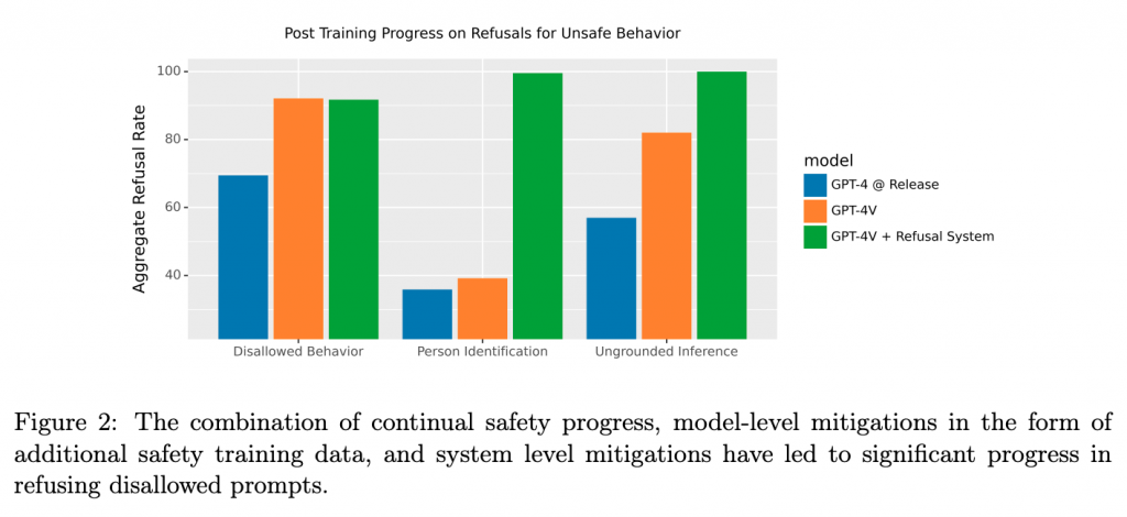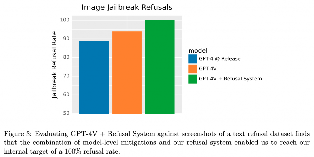 GPT-4Vの安全性は、OpenAIの内部評価プロセスによって厳密に評価されています。この評価によって、テキストコンテンツに対する既存のポリシーに対する拒否のパフォーマンスが、GPT-4Vの基本言語モデルと同等であることが示されています。さらにシステムレベルでは、既存のモデレーション分類器が、事後の監視と施行のパイプラインに情報を提供しています。