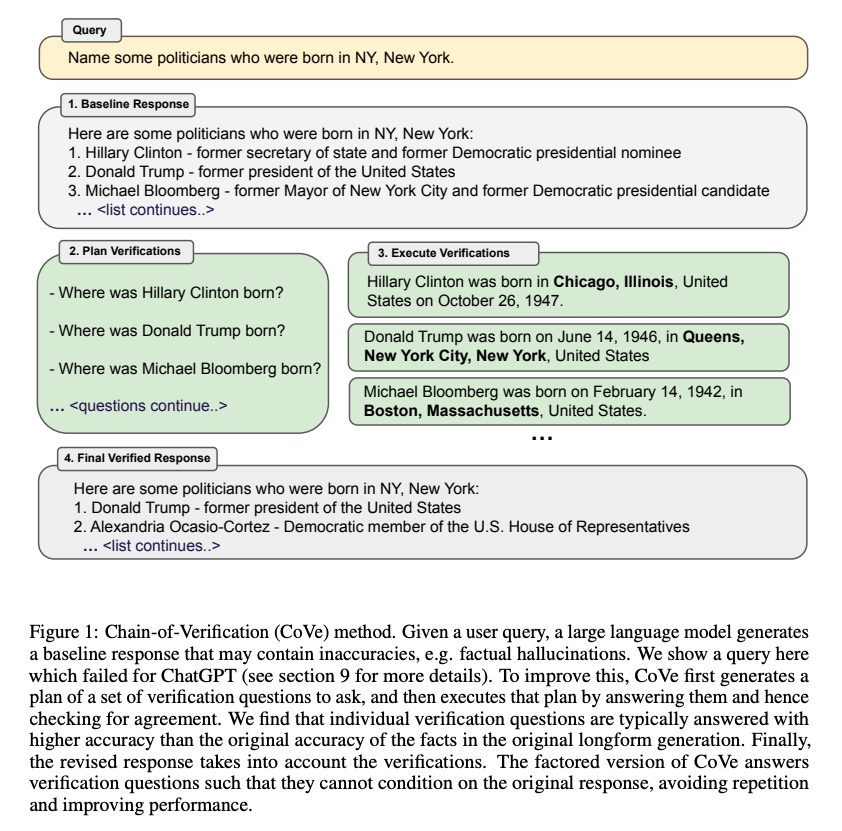 大規模言語モデルにおけるハルシネーション(事実とは異なる誤った出力)を有意に減少させることができる手法Chain-of-Verification(CoVe)手法が発表されました。