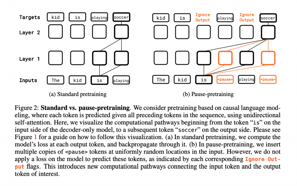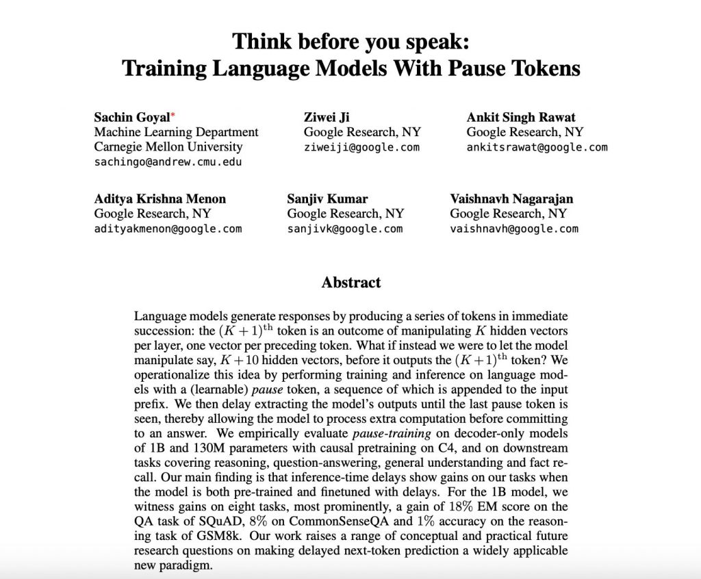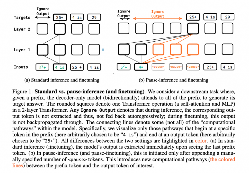 今回、研究者らは、プレトレーニングとファインチューニングの両方のフェーズで「一時停止トークン」を導入することで、モデルの推論能力を十分に表現させることを考案しています。