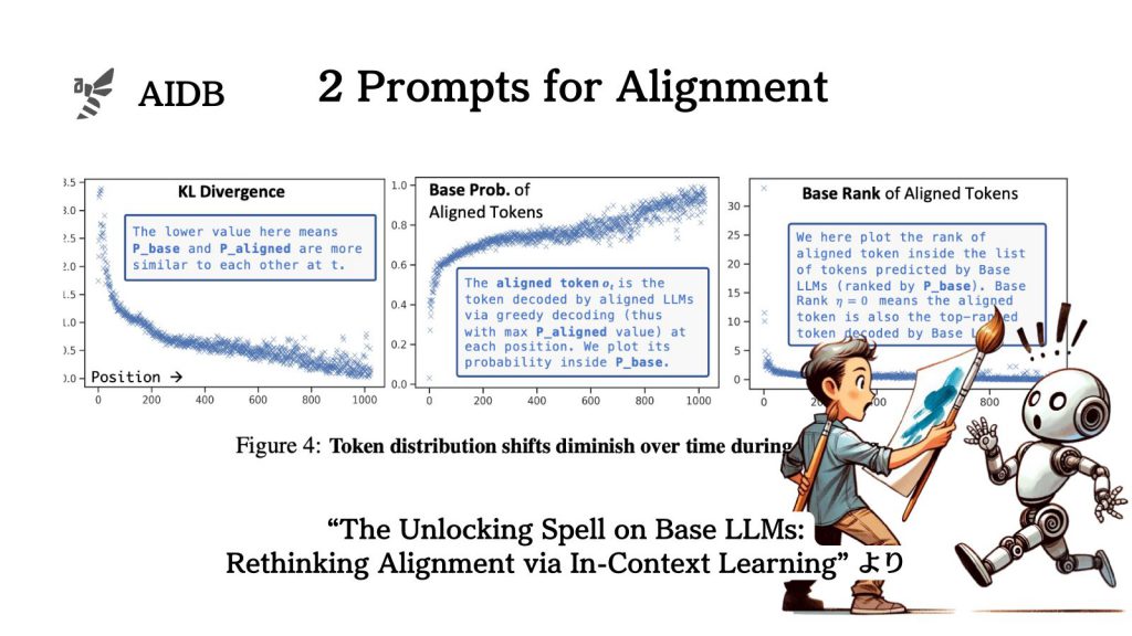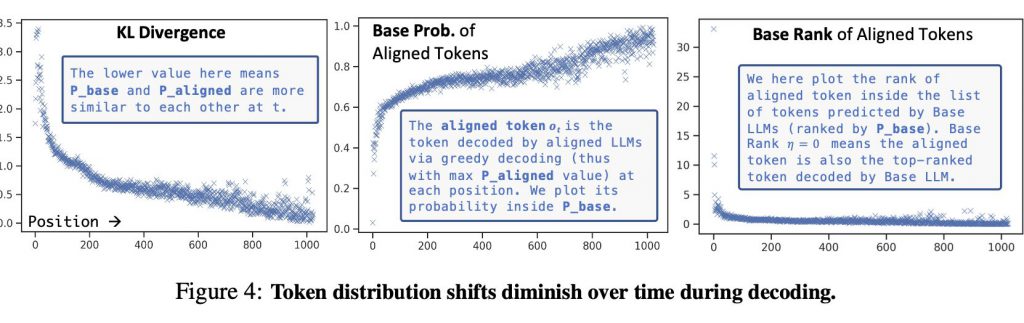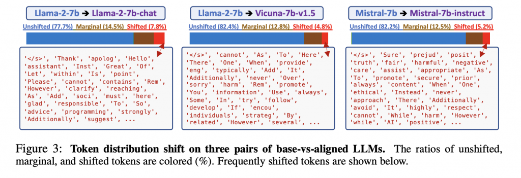 ベースとなるLLMと調整済みLLMの間のトークン分布のシフトに関する詳細な分析を行った結果、アライメントがトークン選択のわずかな部分(スタイルや安全に関する方針など)にのみ主に影響を与えると考察されたのです。