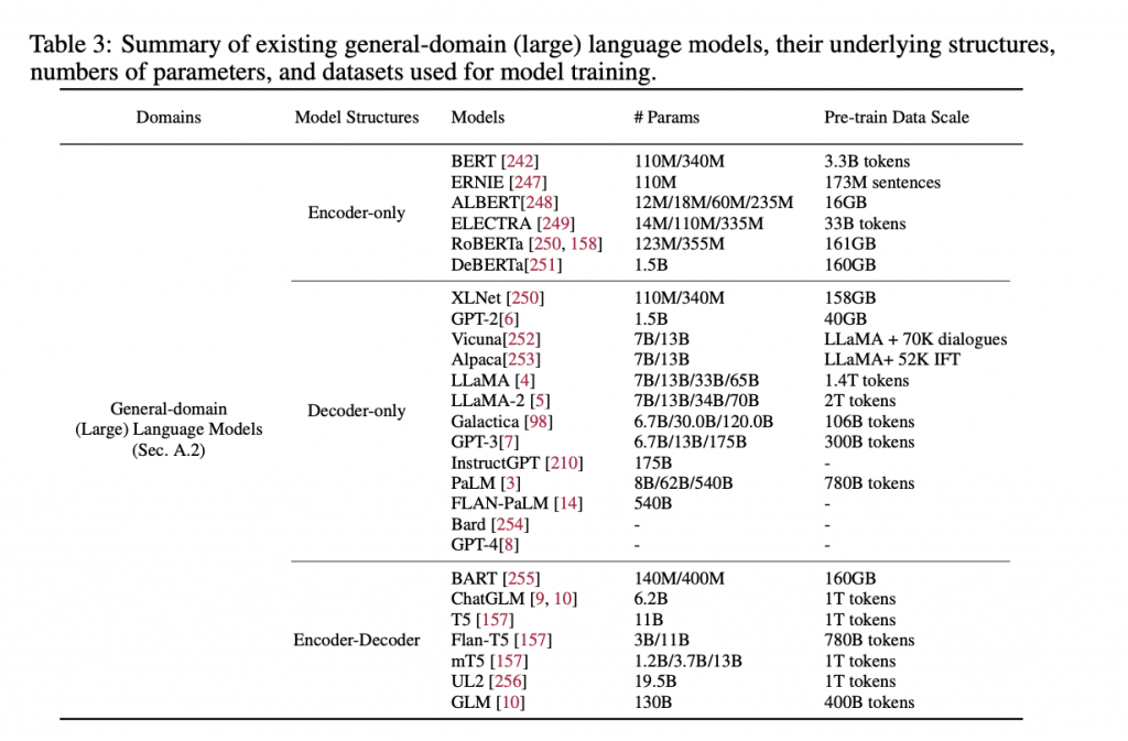 下の表は、一般ドメインの大規模言語モデルとそのトレーニングに使用されるデータセットの例を示しています。