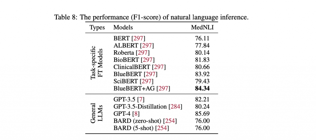 下の表は、推論タスクにおける微調整モデルと一般LLMのパフォーマンス(F1スコア)を比較したものです。