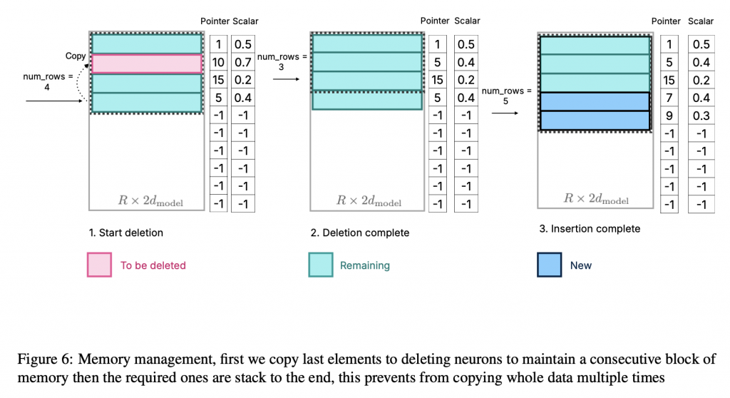 下の図はメモリ管理の工程を示しており、不要データの削除と新規データの追加を通じてメモリ効率を高めるプロセスを説明しています。使用済みのメモリ領域からデータを取り除き、新しい情報を効率的に追加することでメモリの連続性を維持し、無駄なデータコピーを防ぐことで全体の処理速度を改善します。