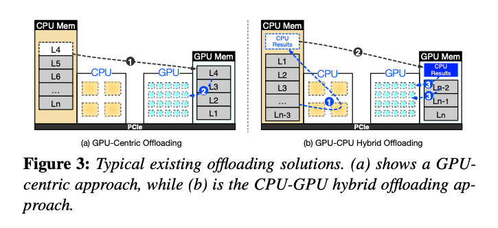 以下は、既存のオフローディング手法とCPU-GPUハイブリッドオフローディングアプローチを比較した図です。従来のGPU中心のオフローディングと、CPUとGPUのリソースを組み合わせたハイブリッドオフローディングの違いを示しています。今回発明されたPowerInferの設計理念を支えるコンセプトです。