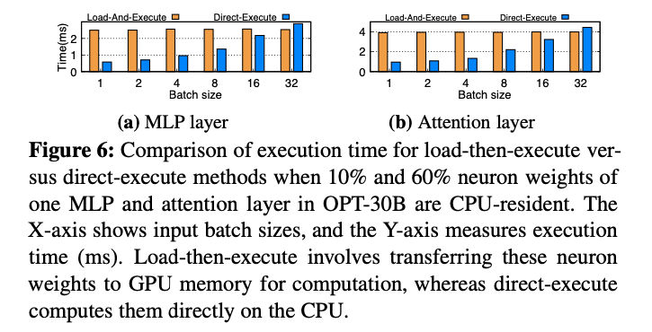 そして下のグラフは、OPT-30Bを例にして、10%と60%のニューロン重みがCPU上にある際の、ロード後実行と直接実行を比較しています。
