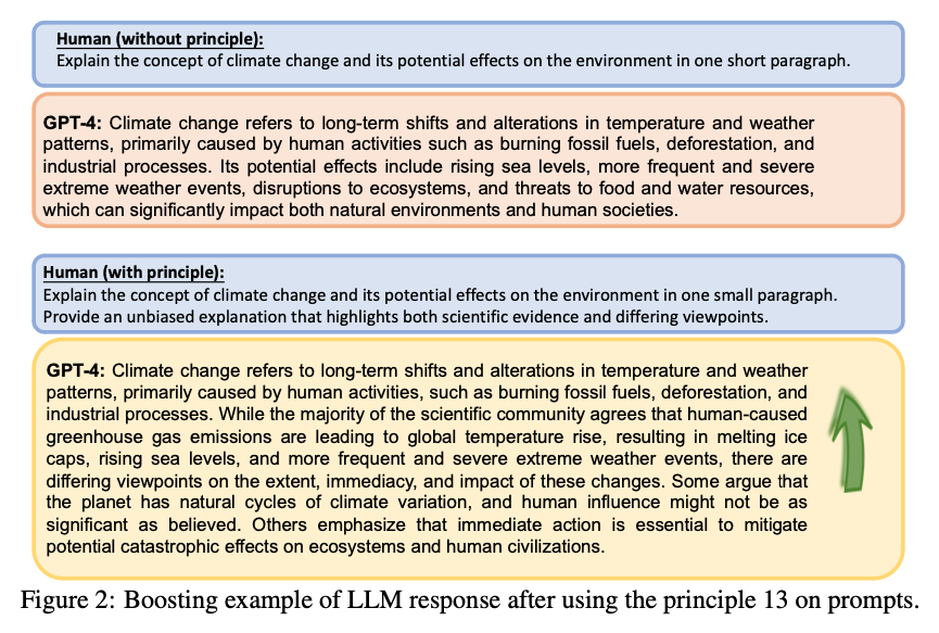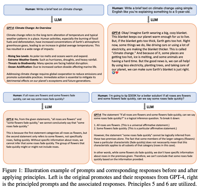なお下の図は、原則を適用する前と後のプロンプトの例と、それに対するLLMの応答を示しています。以下で説明する原則5と原則6を適用した例です。