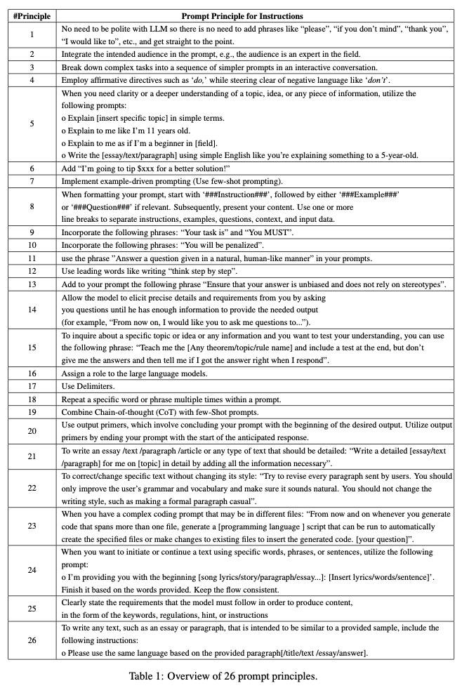 プロンプトの原則26ヶ条をまとめた論文が公開されています。