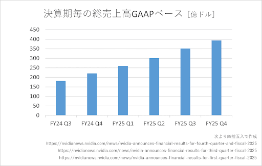 2025年度第4四半期の決算発表によると、NVIDIAの売上高は393億ドル(前四半期比12%増、前年同期比78%増)に達し、データセンター部門の売上高は356億ドル(前四半期比16%増、前年同期比93%増)と、いずれも過去最高を記録しました。