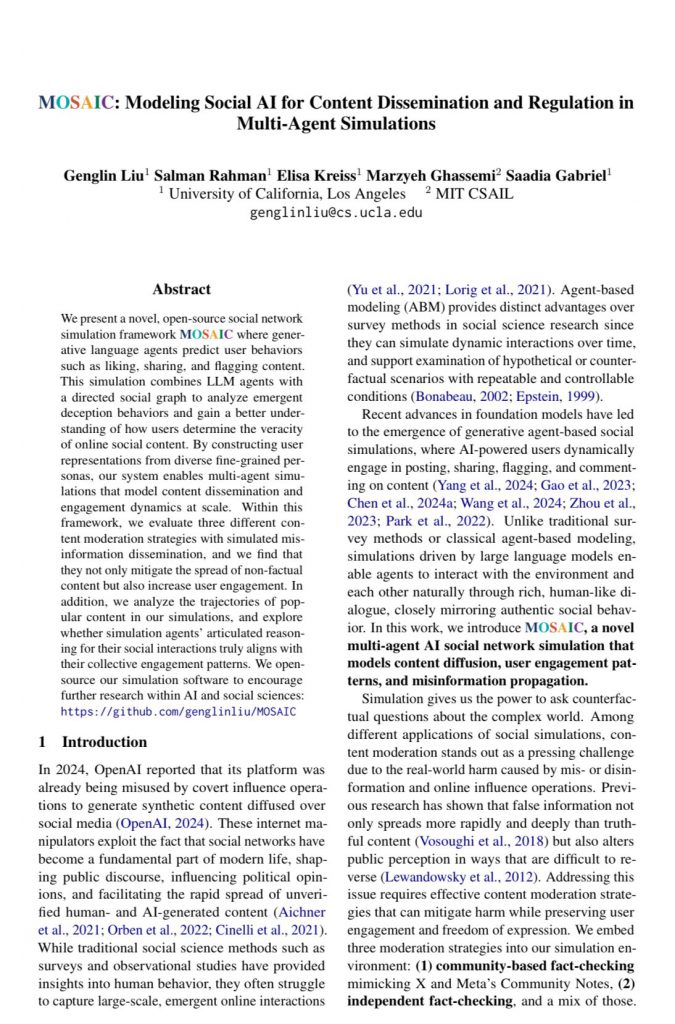 MOSAIC: Modeling Social AI for Content Dissemination and Regulation in Multi-Agent Simulations
