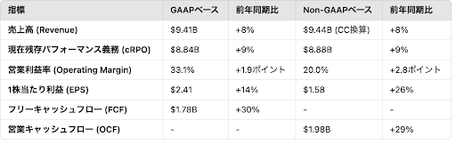 キャッシュフローの面でも好調が続いています。営業キャッシュフローは20億ドル、フリーキャッシュフローは約17億8,000万ドルに達し、前年同期比でそれぞれ29%増、30%増という力強い伸びを示しました。また、将来の売上基盤となる「現在残存パフォーマンス義務(cRPO)」も264億ドルに拡大し、前年同期比10%の成長を記録しています。