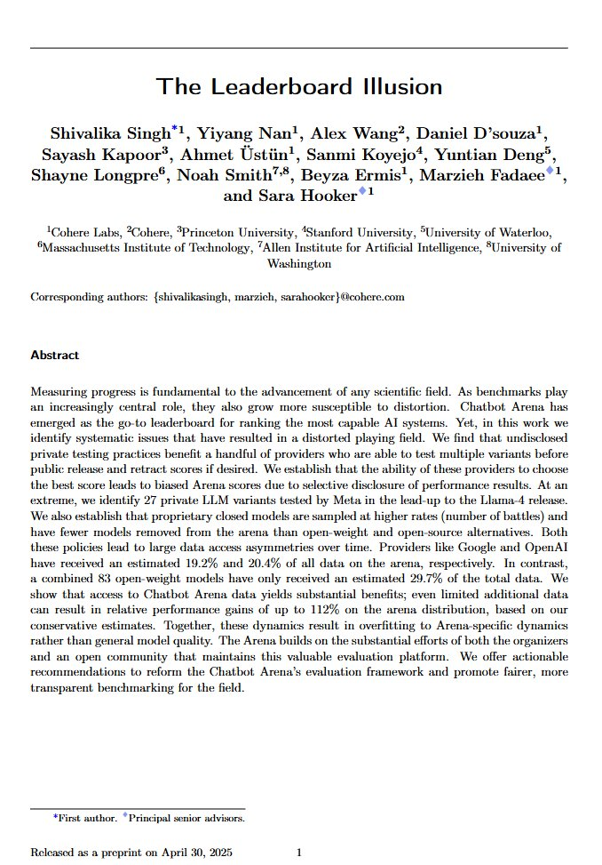 現状、GoogleやMeta、OpenAIなどの大手企業は特別扱いされており、何十ものモデルを非公開でテストし、その中から最も良い成績のものだけを公開できるようになっているそうです。