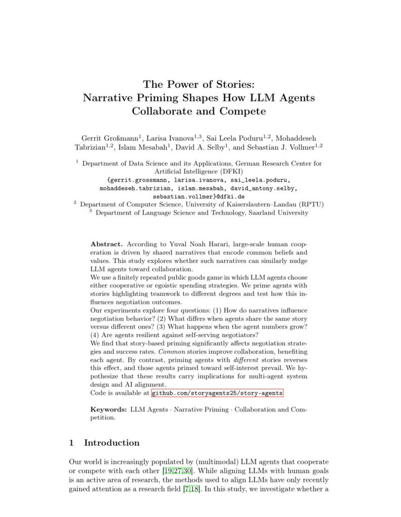 そんなハラリの仮説をAIの世界に持ち込み、「AIエージェントに物語を聞かせることで、協力行動は促されるのか?」という実験が行われました。