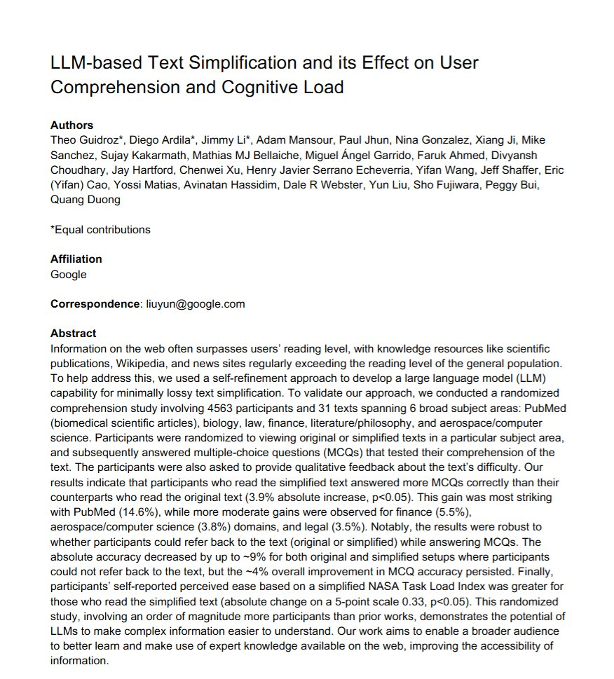 実験では約4500人に対して、もとの難解な文章かLLMが易しく書き直した文章のどちらかを読んでもらいクイズが行われました。すると言い換え版を読んだ人の方が正答率が高く、自身も高く、また”問題文への理解度もアップ”していたそうです。