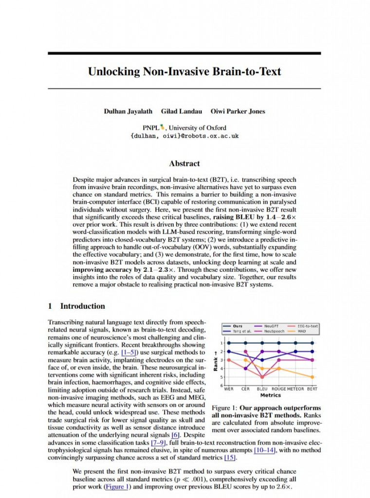 単語ごとの脳波から予測された候補に対して、LLMで文脈の整合性を評価する仕組みを取り入れたのがポイントだそうです(未知の単語が出てきたとしても、LLMが前後の文脈をもとに補完)。