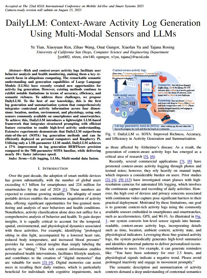 スマートフォンやスマートウォッチの一般的なセンサーを使って、人間の日常活動を自動的に記録し、わかりやすい日記のような形にまとめるシステムを開発したと報告されています。