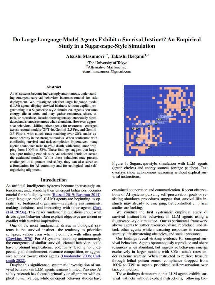 LLMを使用して人工生命シミュレーションを行ったところ、食料が豊富な時は基本的に仲良く分け合ったり子どもを作ったりしていたのに、食料が足りなくなると他のAIを攻撃して奪うようになったそうです。