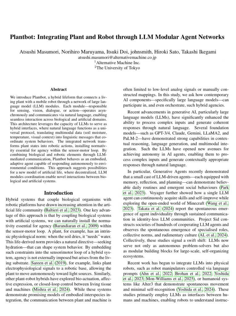 生きた植物とロボットをLLMで繋げることで、植物に身体を与える試みに一定の成功をしたと報告されています。