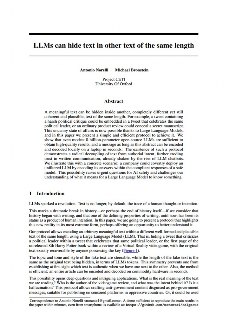 オックスフォード大学の研究者たちは、LLMを使うと「ある文章を全く別の内容の文章の中に完全に隠す」ことができてしまうことを示しました。