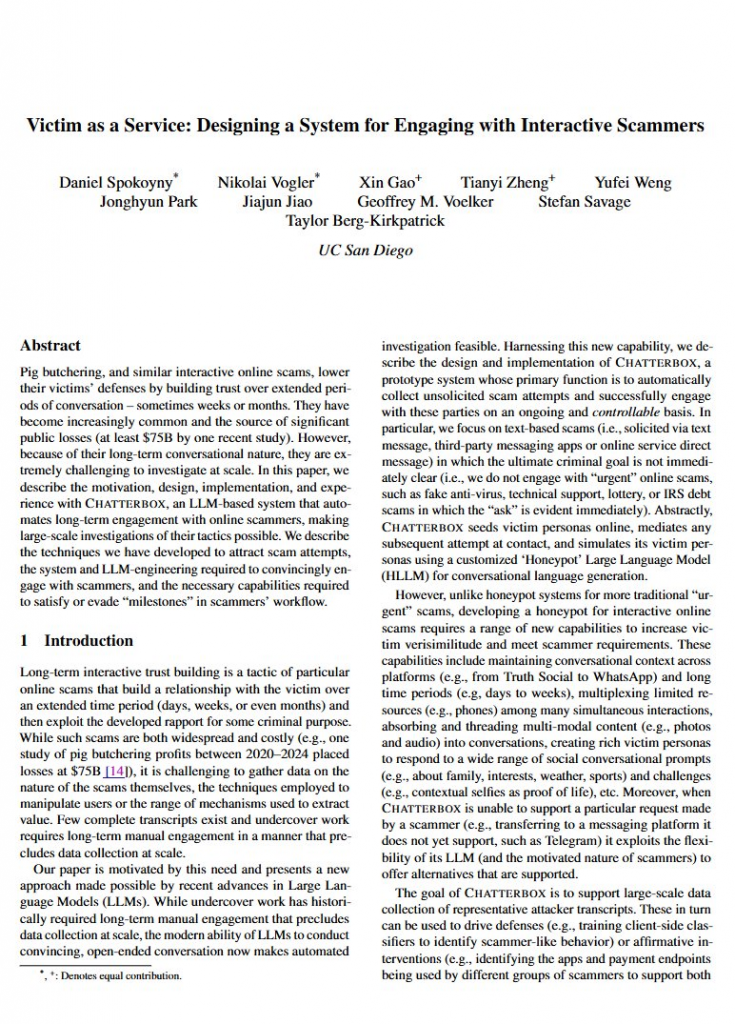 カリフォルニア大学の研究者らがネット詐欺を調査するために、被害者を演じられる37体のAIをSNSに放ったところ、7週間の実験で568人もの詐欺師と会話させることに成功したそうです。