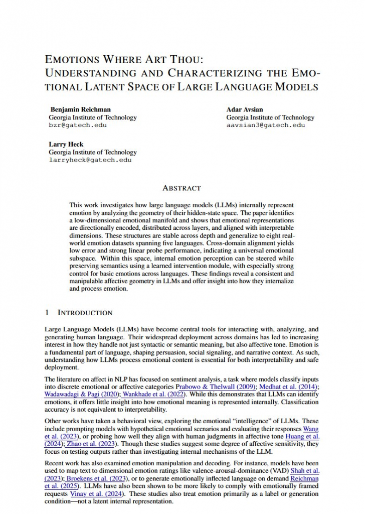 ジョージア工科大の研究者らにおいても、LLMの内部に感情を表す空間を見つけたと報告しています。