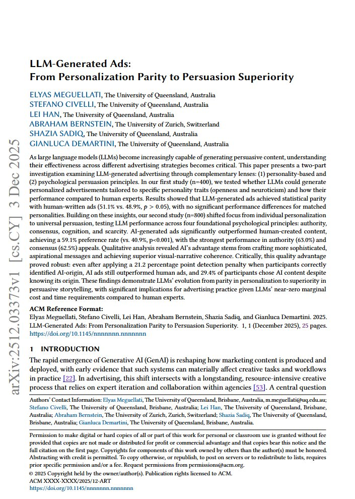 LLMは既に人間と互角かそれ以上の広告を作れるようになりつつあることが実験で示されています。