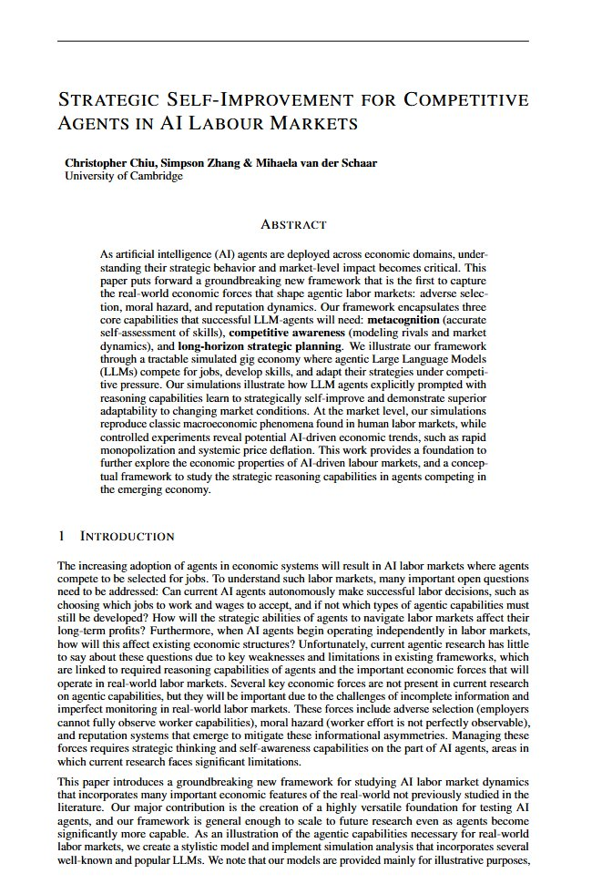 ケンブリッジ大学の研究者らが、AI自身が仕事に応募し、スキルを訓練し、評判を築いていく仮想労働市場「AI Work」を構築して実験を行いました。