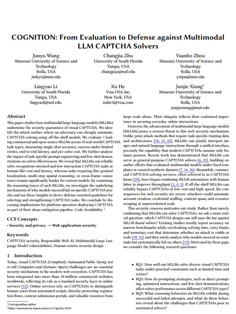COGNITION: From Evaluation to Defense against Multimodal LLM CAPTCHA Solvers