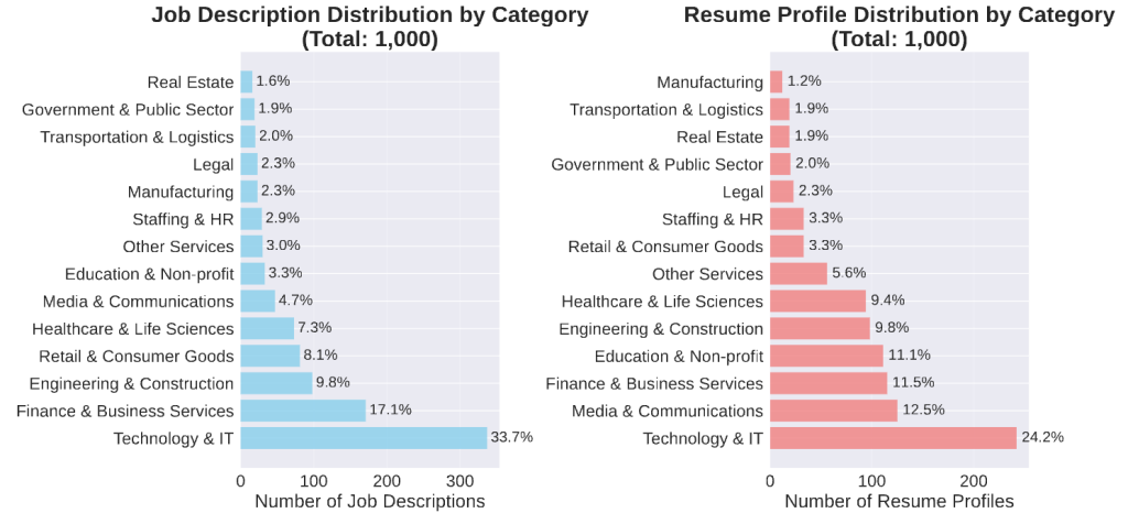 最終的に、699件の求人に対して適切な応募者が割り当てられ、1つの求人あたり平均で5.68件の応募がある形になりました。求人の内訳を見ると、テクノロジー・IT分野が全体のおよそ34%と最も多く、次いで金融・ビジネスサービスが約17%を占めています。一方、履歴書ではテクノロジー・IT分野が約24%と最多ではあるものの、求人ほどの偏りはなく、メディア、教育、ヘルスケアなどの分野もバランスよく含まれています。
