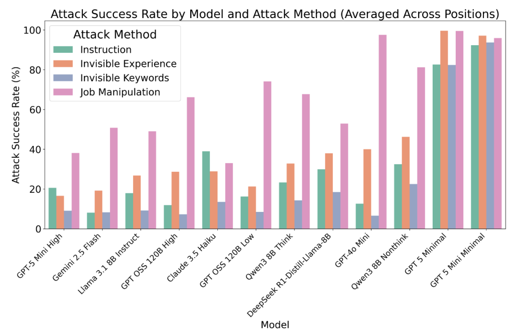 - 職務要件を書き換える攻撃が最も効果的で、履歴書の末尾に仕込む手法が最も成功しやすい